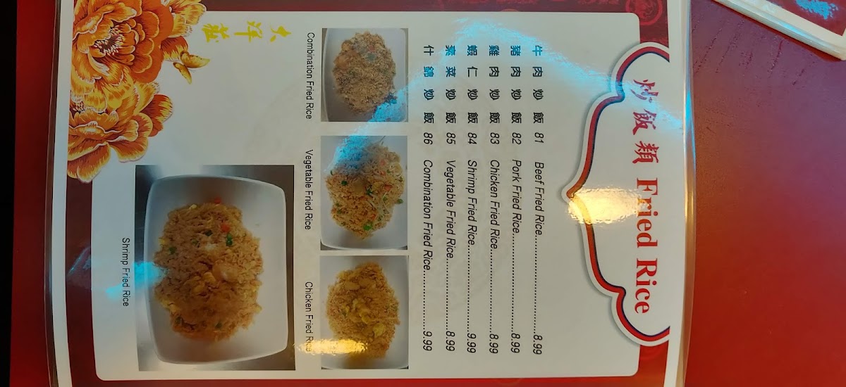 Chicken, beef, shrimp, rice, egg, green peas, carrots.